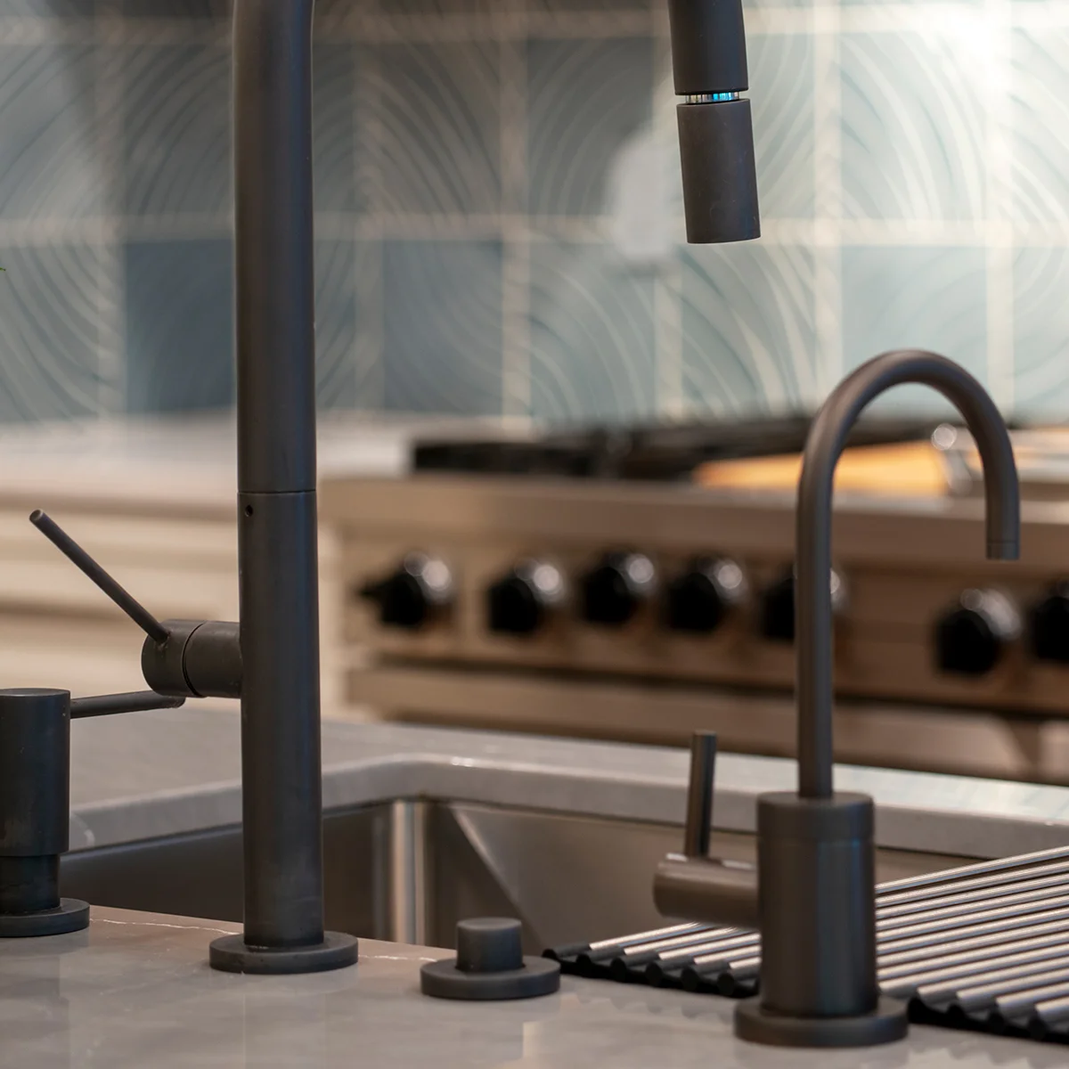 A ceiling-high backsplash immediately catches the eye of anyone who enters this kitchen.