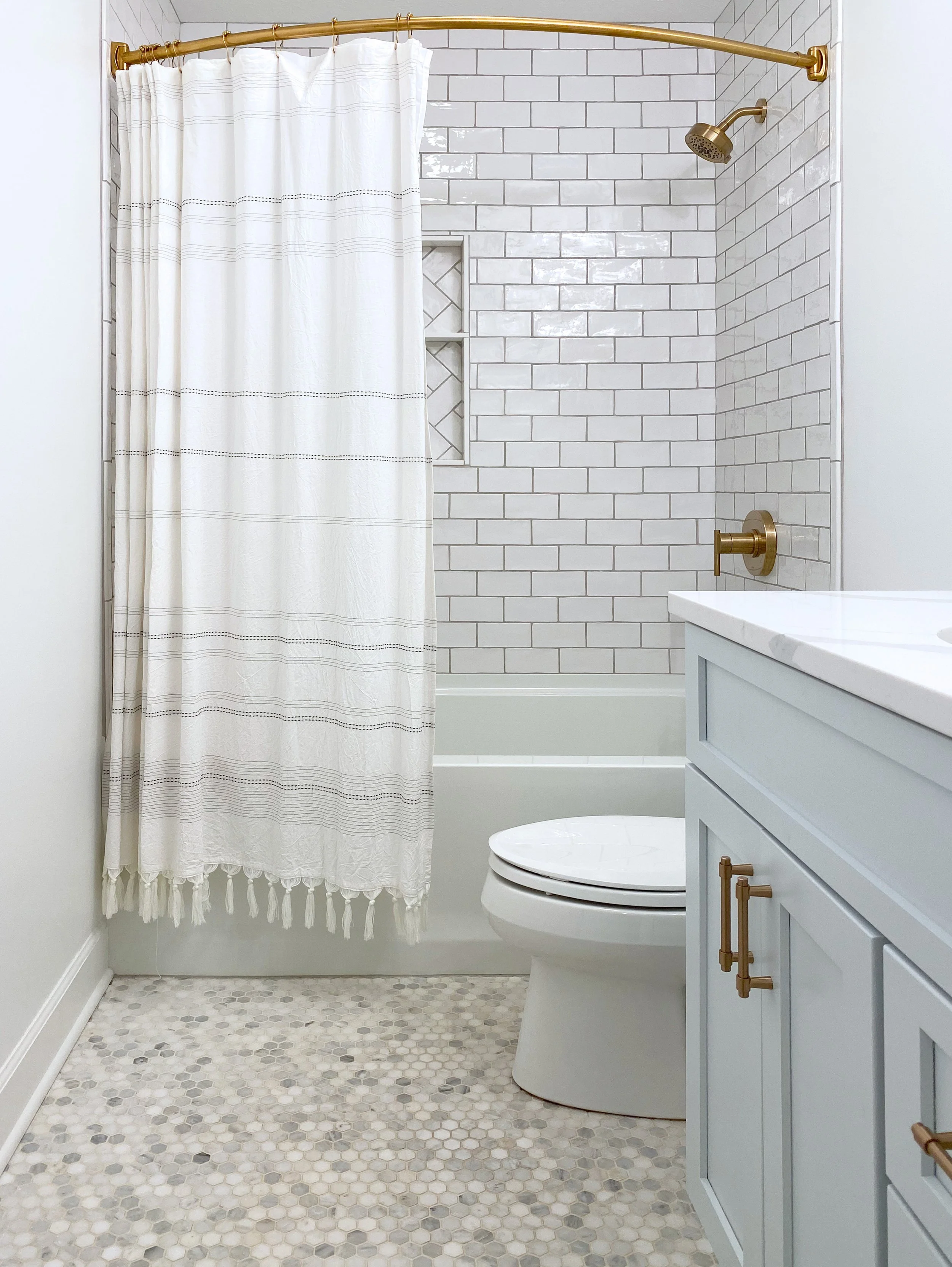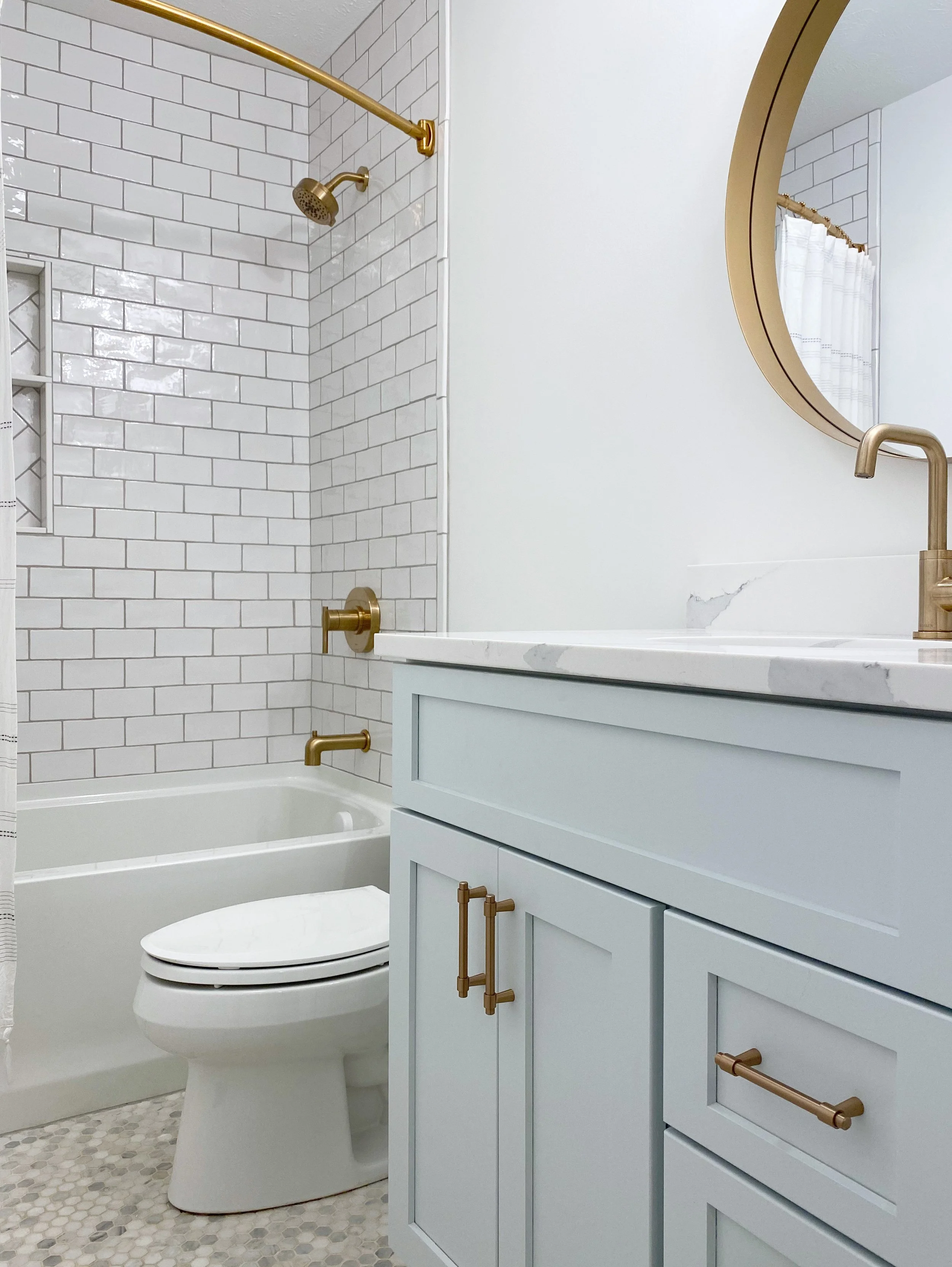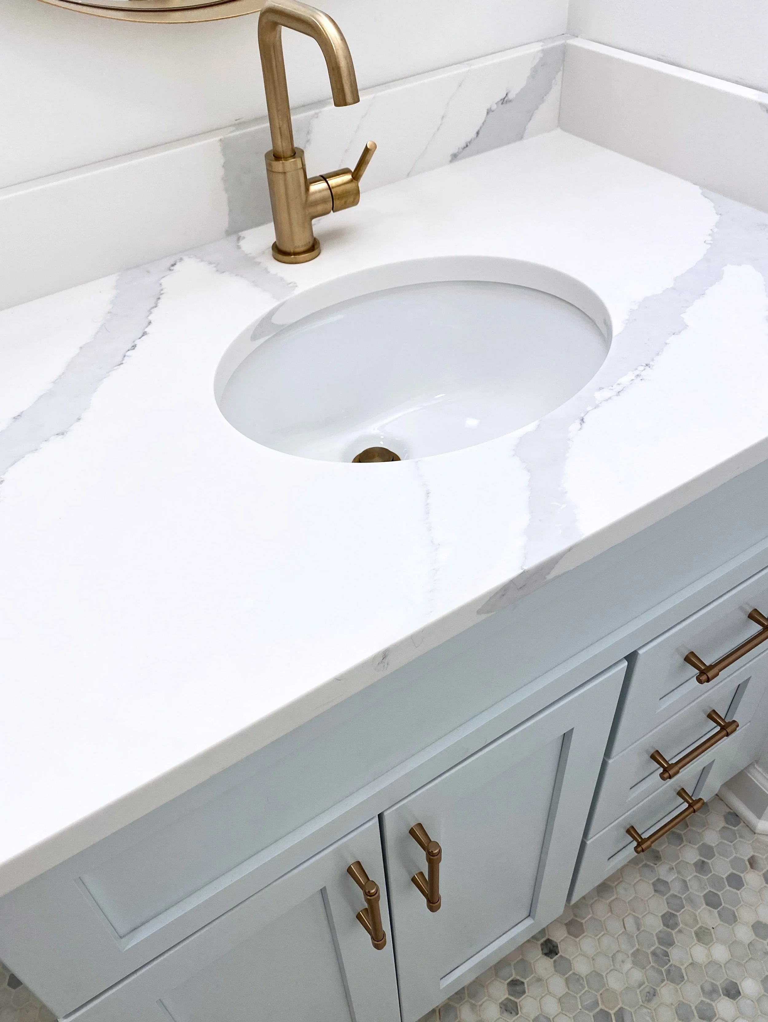 Cabinetry: Starmark – Custom Color • Faucets: Danze Parma Collection • Shower: Sterling Tub • Countertop: Envi Quartz Calacatta Vittoria • Hardware: Amerock Destine Cabinet Pulls • Tile: Virginia Tile Crafted Gray Gloss and Marmiline Polished