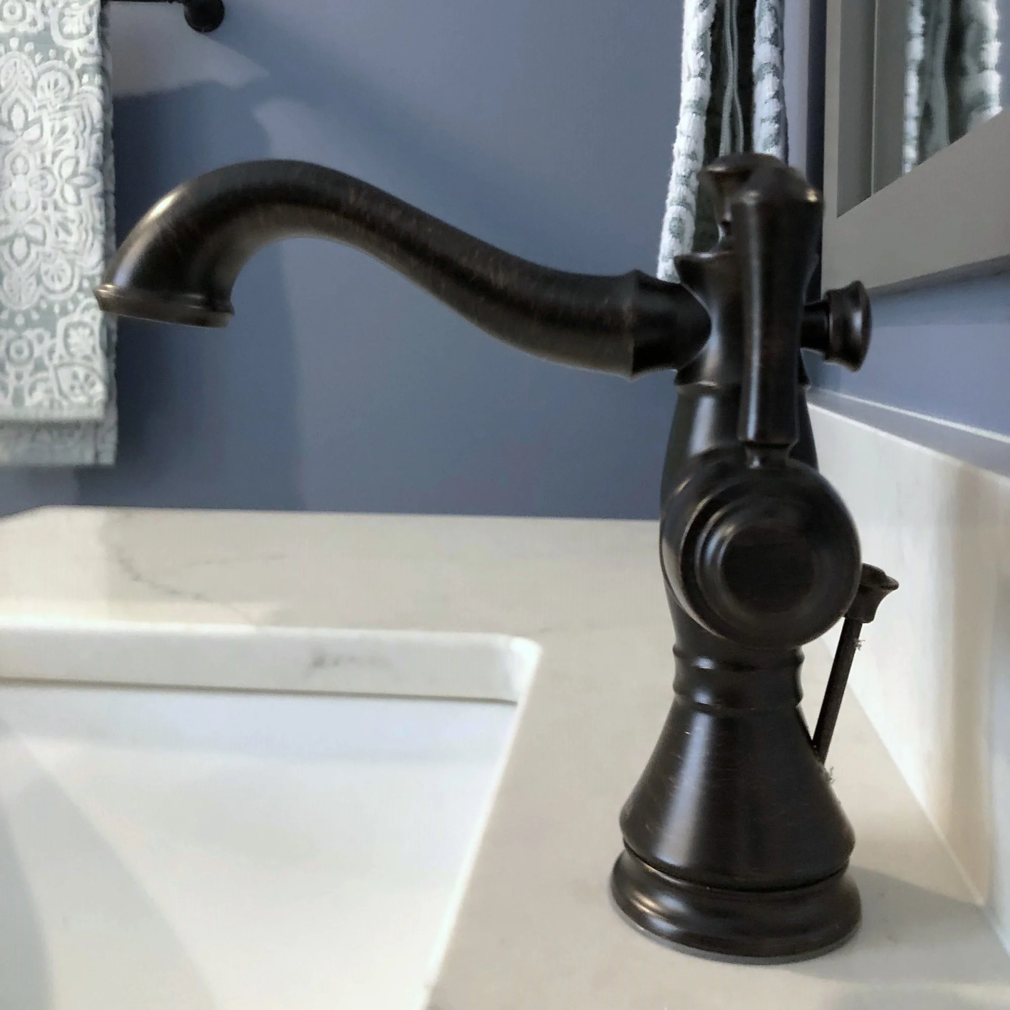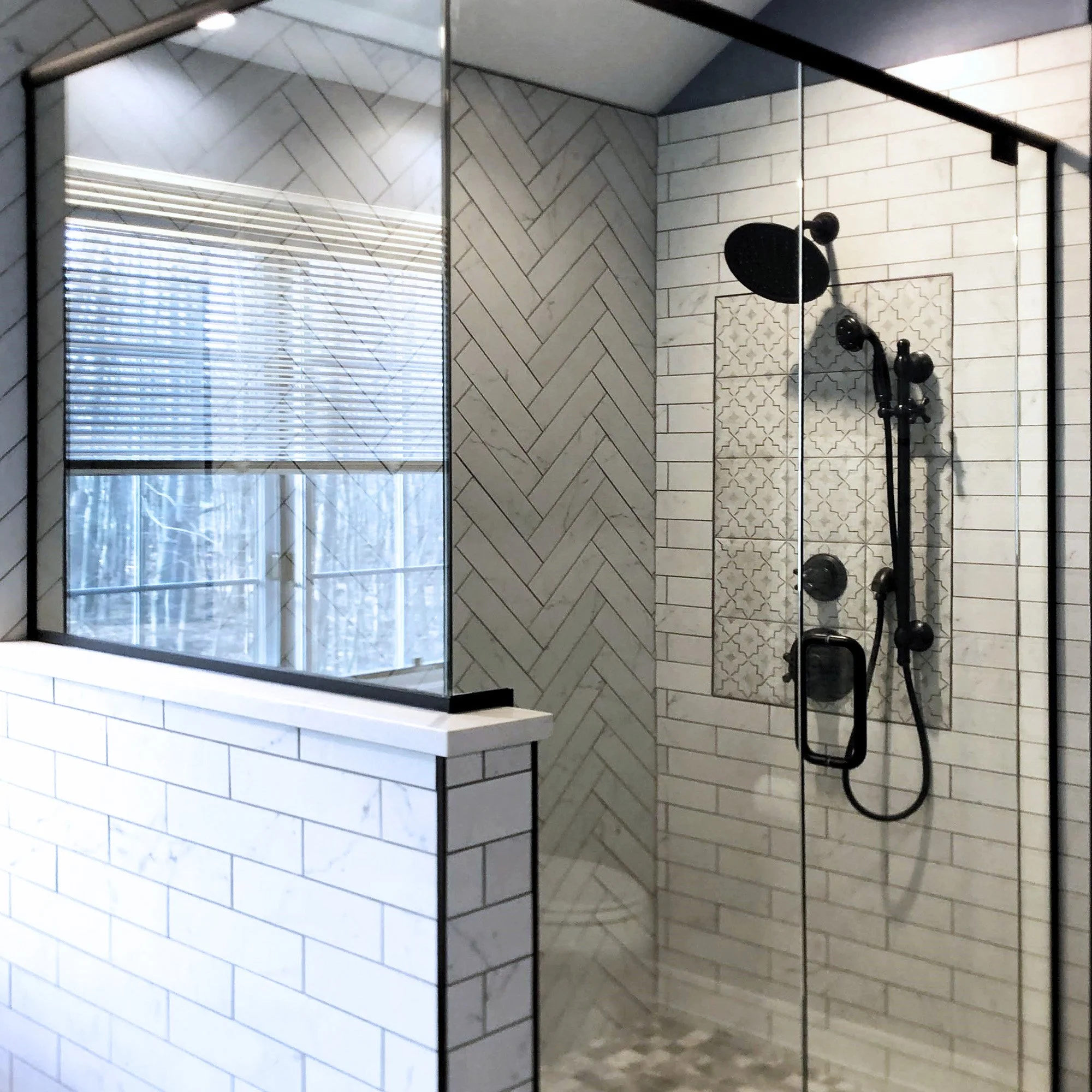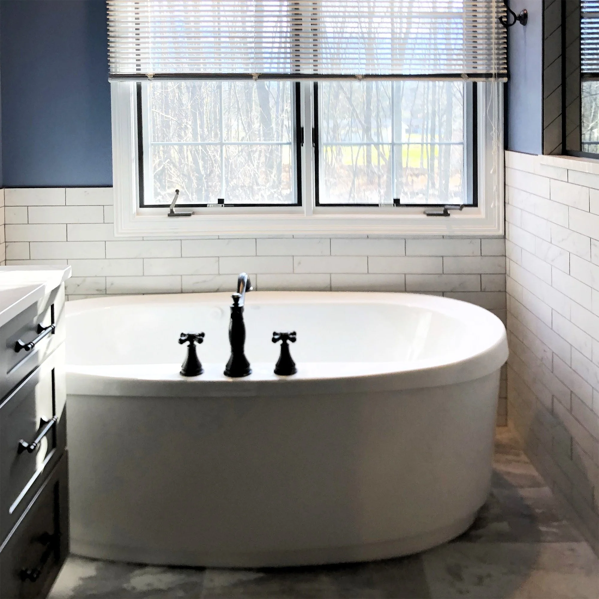Beautifully features Integrity Cabinetry in Atlantic Breeze door style and is in the graphite finish. The countertops are MSI Calacatta Monaco. The tile work is from Virginia Tile and is Quest Gray in 12 x 24 for the bathroom, 2 x 2 shower tiles, Carrara Honed 3 x 12 tiles on the shower walls and tub surround with Alesso Como Deco tile from Tile Bar for the accent tile. The plumbing fixtures are from the Delta Davenport Collection in oil rub bronze finish, and a Jacuzzi Inizio jetted freestanding tub.